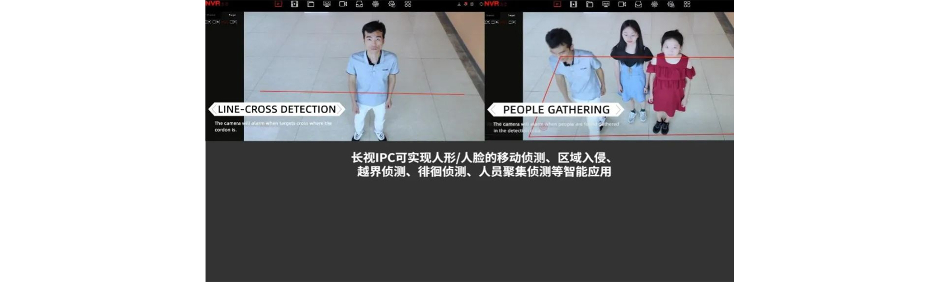 包含基于人形/人脸的挪动侦测、地区入侵、越界侦测、盘桓侦测、职员堆积侦测等,